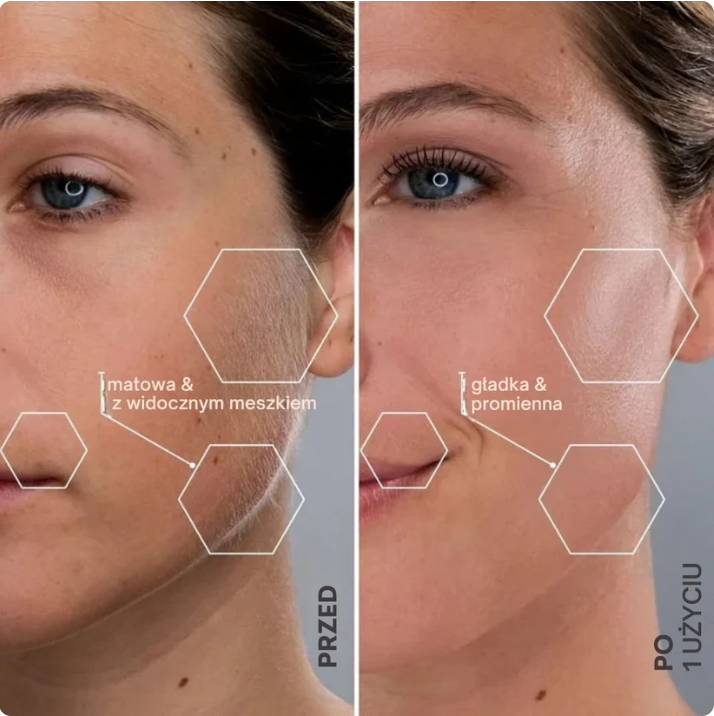 Efekty widać natychmiast po pierwszym użyciu — skóra jest gładka, świeża i promienna, a makijaż nakłada się znacznie lepiej.